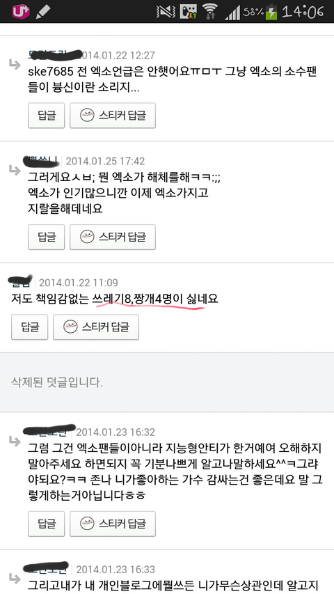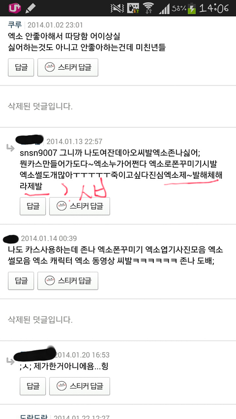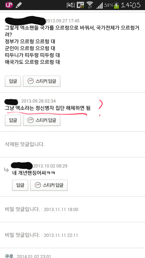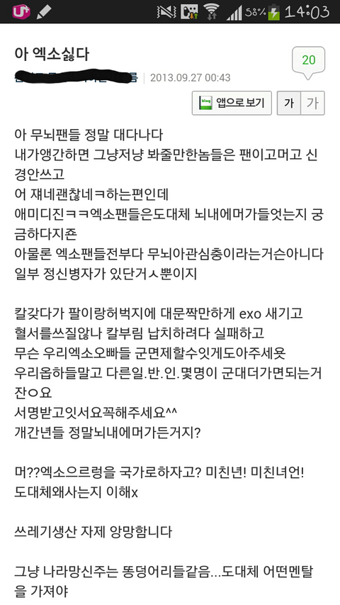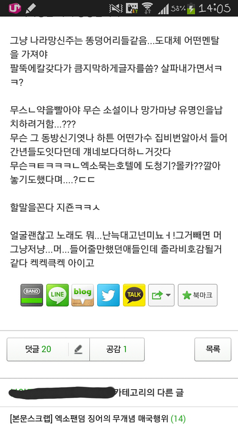 이거뭐야ㅋㅋㅋㅋㅋ댓글들이 더 가관이야ㅋㅋㅋㅋㅋ엑소 노래 애국가나 자해사진 군면제등은 무개념안티들이 한건데 저사람이 몰라서 썼다고 쳐도 댓글들은 뭔데 슈발 조카 화나네ㅋㅋㅋㅋㅋㅋㅋ