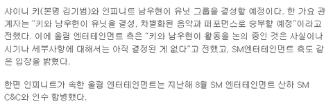 대체 이게 뭔말이냐. 가요관계자는 말을 그렇게하고 소속사는 결정된게 없다하고 ㅋㅋㅋ 소속사말을 따라야지 가요관계자말을 왜따느냐곸ㅋㅋㅋㅋㅋㅋㅋ그리고 합병했다는 얘기 작작좀 하지 왜 계속 그렇게 합병합병 해싸!! 그러면서 제목은 유닛결성? 이게 언제나온기산데 자꾸 내놔. 성열이 사장된거나 기사내놔봨ㅋㅋ치킨집 연거 ㅋㅋㅋㅋ 아직 모르시나? 저번에는 잘아시더만?