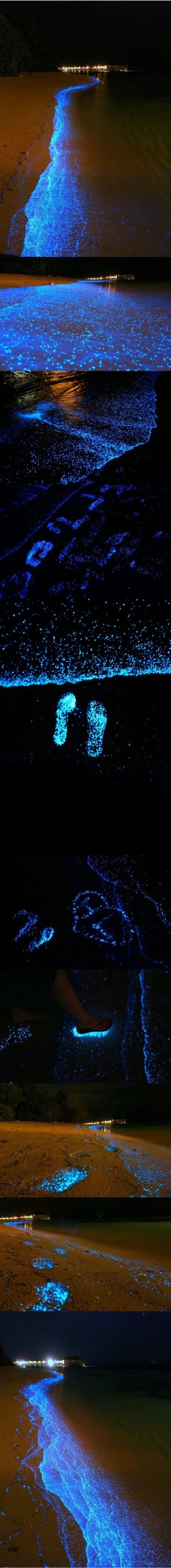 식물성 플랑크톤때문에 빛나는거래요.. 돌던지면 물결따라서 퍼지는데 정말 이뻐요ㅠㅠㅠ아 그리고 몰디브에만 있는게 아니구 한국에서도 서해바다에 식물성플랑크톤이 동해보다 많아서 봄쯤,초여름쯤 가보시면 운좋게 보실수도 있어요!저는 7월에 홍성 남당리에서 한번보구 당진 도비도에서 한번 봤는데 정말 이뻐요!멀리가지 마시구 시간날때 가까운 한국에서 보셔요