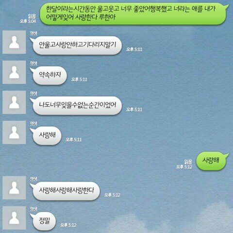 나만 좋아하면 되는거지 나 그리고 너말고 다른사람만날 용기 아직은 없다 니가 너무 내안을 많이 차지하고 있어서 다른사람으로는 못채울거같아 사랑하고 사랑해워아이니아이시떼루 나도 너랑 있는 한달동안 너무 행복하고 고마웠고 울고웃고 했었던거 같아서 너무 고맙다 지금은 상황이 이렇게 됬지만 꼭 니친구한테서 나쁜소식이 아닌 좋은소식 전해 들었으면 좋겠어 약속해 사랑하고 사랑해