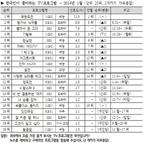 갤럽에서 조사한 1월 TV프로그램 선호도