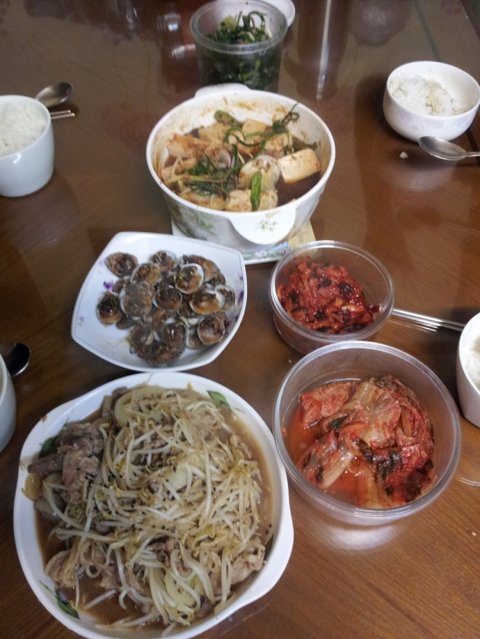 1. 모시조개 바지락 달래 된장국 / 꼬막찜 / 돼지고기숙주볶음 / 밥