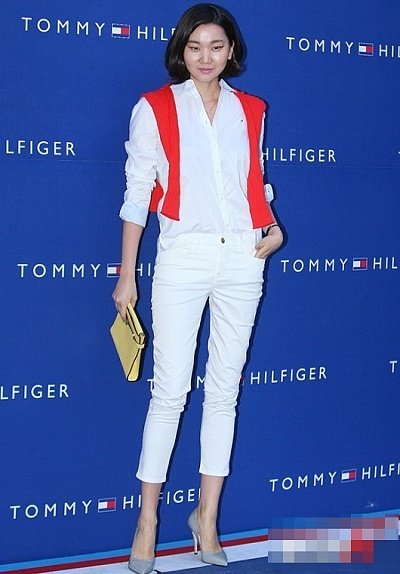 가장 최근의 올화이트 패션에 레드 포인트 준 패션
