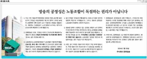 MBC의 추태 역시 이게 끝이 아니다. MBC는 이틀 연속으로 보수 성향 일간지 1면 에 광고를 실어 사측 입장 홍보에 나섰다. 20일에는 조선·문화일보·매일경제에, 21일에는 동아·중앙일보·한국경제에 ‘방송의 공정성은 노동조합이 독점하는 권리가 아닙니다’란 제목의 광고를 실었다.