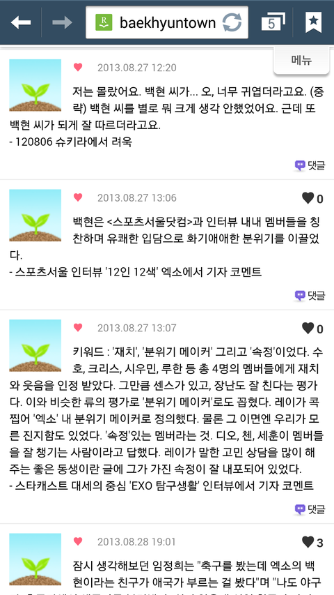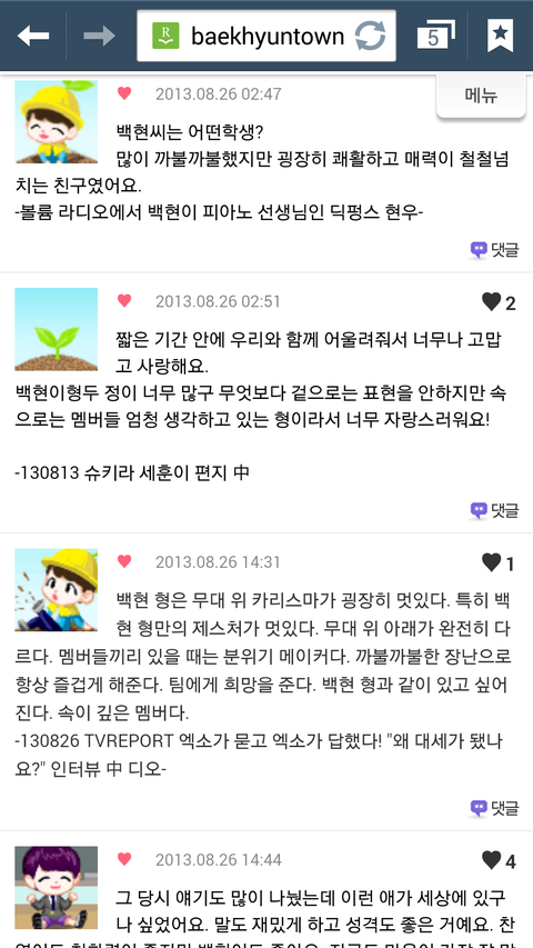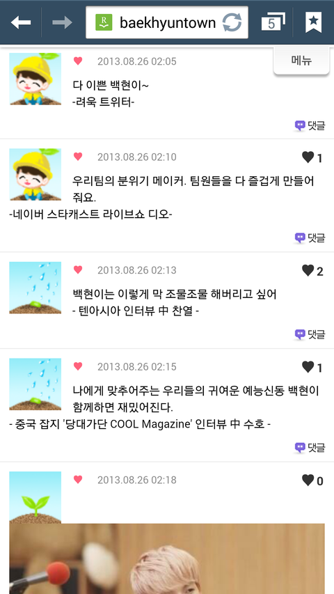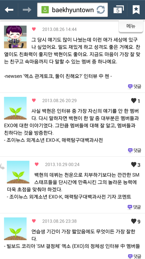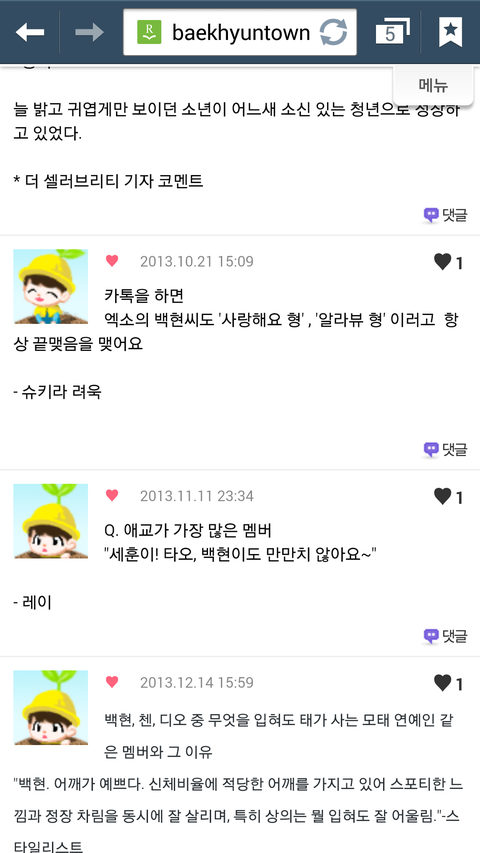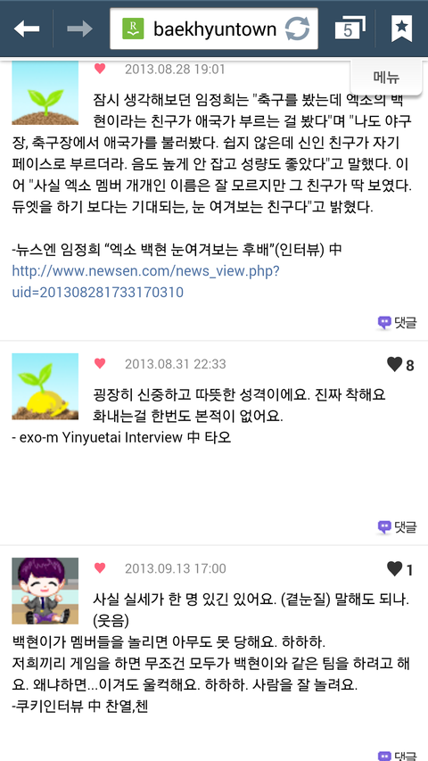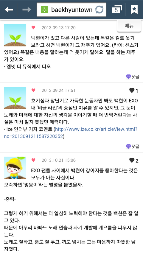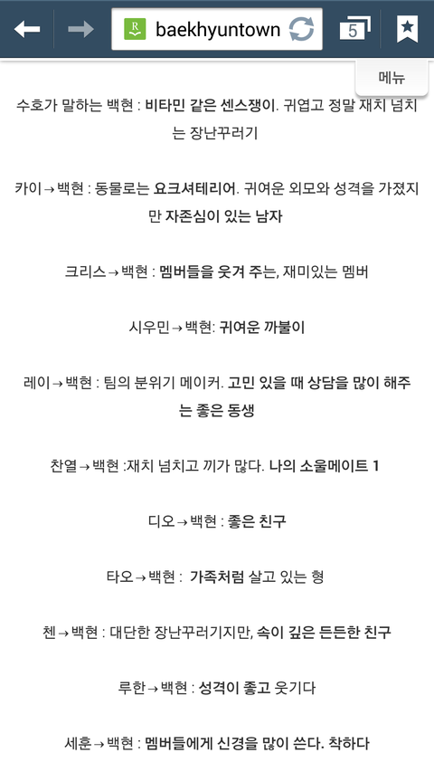 다른사람들이말하는백현이뿌듯한것도있고귀여운것도있지만무엇보다애가진국이란걸알수있어서좋다ㅋㅋㅋㅋ난백현이 인터뷰보고 입덕했어 멤버이말하는00이런식으로인터뷰 한걸봤는데 백현이가 유독다른멤버들의비해서 엄청길게썻더라고 본사람은알꺼야 그거보고아얘는되게 멤버들에대해서 잘알고칭찬하는거 좋아하는애구나란게느껴지더라구 백현아너가짱이야