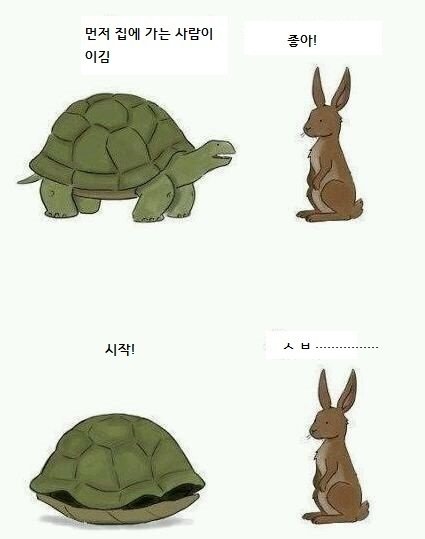 거북이가 토끼에게 ㅡㅡ야 우리 누가 집에 먼저 들어가나 시합하자 ^^