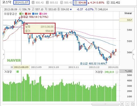 <그래프 3> 2013년 8월 9일과 2014년 1월 7일 시점 코스닥 지수 비교. 554.93에서 504.86으로 10%에 가까운 하락세임을 알 수 있다.