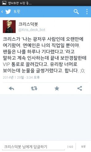 크리스는 오랫동안 기다린 팬들한테 인사하려고 일반통로로 갈라그랫는데 경호원이 막음