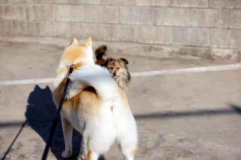주인이랑 산책 중이었는데 심바보고 뛰어왔어요.
