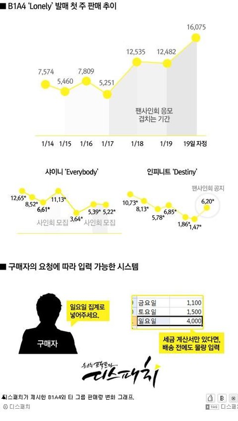 ① 디스패치는 '사재기는 없습니다!' 꼭지에서 B1A4 측이 제시했던 해명을 그대로 옮기고 있다. 판매량 급증이 자연발생적이지 않다는 의혹과, 그 이유는 팬싸인회 때문이라는 해명이 마치 B1A4 측을 대변하듯 설명되어있다. B1A4 판매량 급등의 정당성을 확보하기 위해 또 다른 인기 아이돌 두 팀의 자료를 가져와 제시하기도 했다. 그러나 디스패치가 제시한 그래프만 보아도 B1A4 측과 디스패치가 현상을 아전인수격으로 해석하고 있음을 알 수 있다.