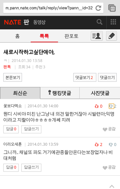 난 팬질 때문에 이러고 싶지 않지만, 원한다면 현피도 되는데? 익명이라고 기분 나쁘게 말한 것도 아니곸ㅋㅋ 나 성격상 그리찌질한 짓은 안해 왜 센캐라 생각하지.? 내가 욕해가면서 내 의견 말한 것도 아니고 그저 내 의견 니가 알아먹기 쉽게 적은거 아냐ㅋㅋ니도 니의견 적엇길래.. 오히려 욕하면서 쎄게 나간건 넌데.? 어린거 티내? 내가이런거 가지고 싸워야되? 왜 내가 너한테 욕먹어야되.? 니가 니의견에 당당하면 욕말고 니의견을 말했어야지 왜?쫄리나? 꿇려.?