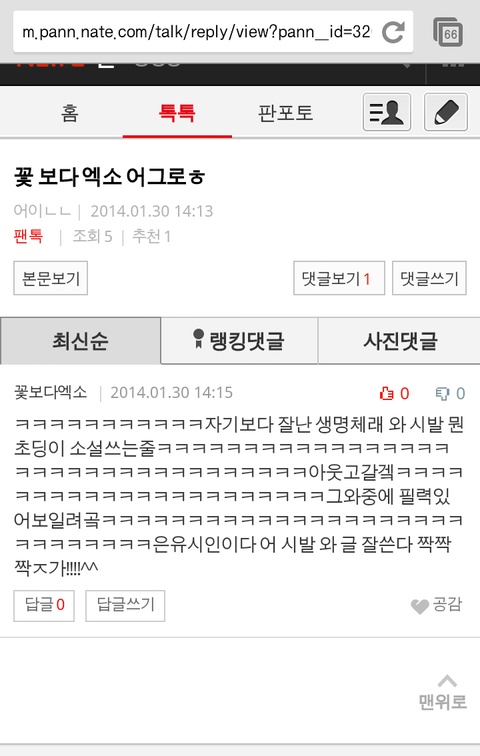 악개년등장이다ㅠㅠㅠㅠ개쎄; 초면에 익명이라고 욕한건 지면서 나보고 쎄대; ㅠㅠㅠㅠ걍 노답인증하러온듯ㅋ개빠앗네ㅋㅋㅋㅋ지까이는 걸모르고 무모한 도전중ㅠㅠ..무서워 이게 바로 인터넷 중이병이구낭ㅎ내가 겪게될줄이야 부들부들하나봐지금;;ㅜ