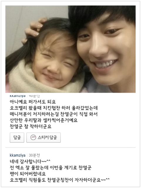 오크밸리 행사뛰러갔을때 협찬해준 치킨집 사장님이 딸이랑 사진찍어달라고 올라갔는데 매니저한테 저지당했다고함 근데 찬열이가 매니저 막으면서 괜찮다고 사진 찍어준다고..ㅠㅠㅠ 찬열아ㅜㅠㅠㅠㅠㅠㅠㅠ날죽여라ㅠㅠㅠㅠㅠㅠㅠㅠㅠㅠㅠㅠ마음씨까지 이쁘면...ㅠㅠㅠㅠㅠㅠㅠ으아유ㅠㅠㅠ수니쥬금ㅠㅠ그와중에 아이가 참 예쁨..ㅠㅠ전생에 나라를 구한듯..