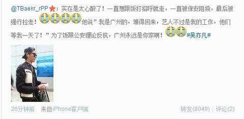 It just makes me so sad! He kept wanting to greet the fans before going, kept being stopped by the guards from doing so, and was finally pulled away by force! He said "I'm from Guangzhou, it's one of my rare times back here, being an artist is only my job, they've waited for me for an entire day!" Protesting and arguing with the guards for the fans, Guangzhou will always be your home!