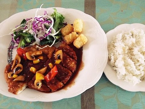 정육점 돈까스 사와서 튀기고 파프리카 양송이 넣어서 소스만듬ㅋ 구색 맞추느라 맛감자도 함께ㅋ