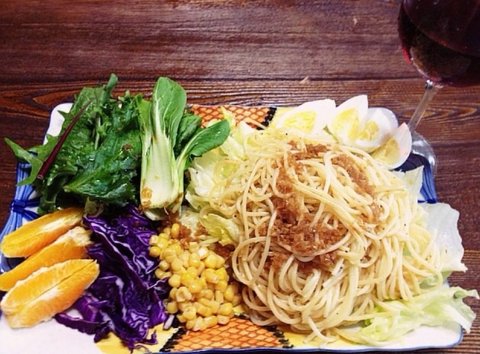 샐러드 야채들이 많아 샐러드 스파게티 해봄ㅋ 집에 늘 만들어 놓는 오리엔탈 소스 곁들여서 냠냠