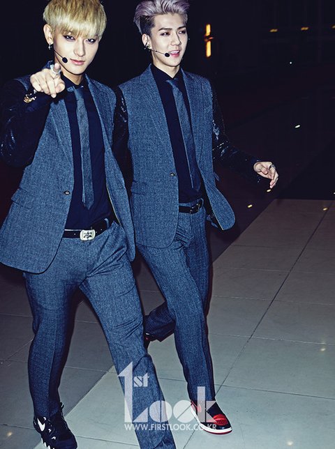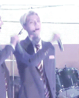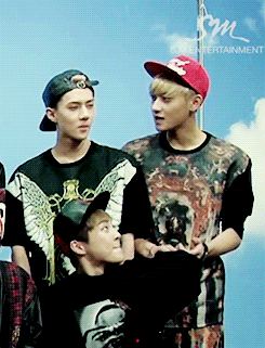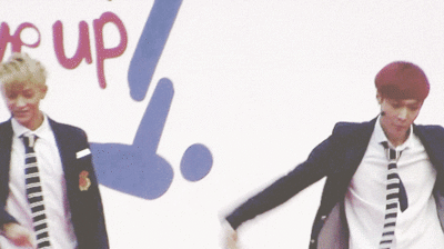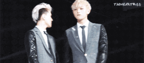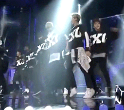 무대에서 서로를 보고 웃는 엑솜의 막내와 엑솤의 막내