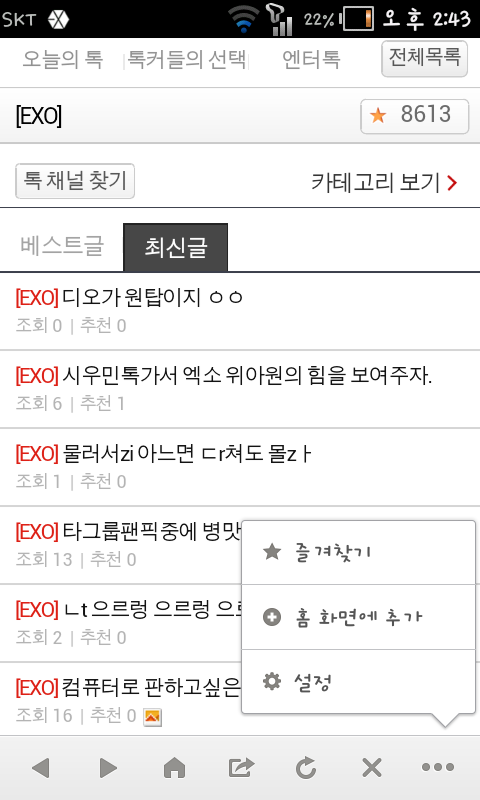 아래 탭눌러진데 보면 홈화면에추가 있지? 그거누르면 홈에 네이트판이라고뜨는데 그거 누르면 바로 여기로 들어와져 모르는사람들 있대서 ㅋㅋㅋㅋㅋ