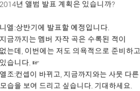 자작곡 병헌이랑 민수는 한다는 소리 들었는데 니엘아...☆★ 게다가 새로운 컨셉이래... ㄸㄹㄹ 근데 우리애들 좀 쉬어야할텐데.. 상반기에 대형가수들 컴백도 많이 하고 이번에 컴백하면 다들 말보다 행동으로 스밍도 하고 점수도 높여주자. 일위 시켜줘야지♡