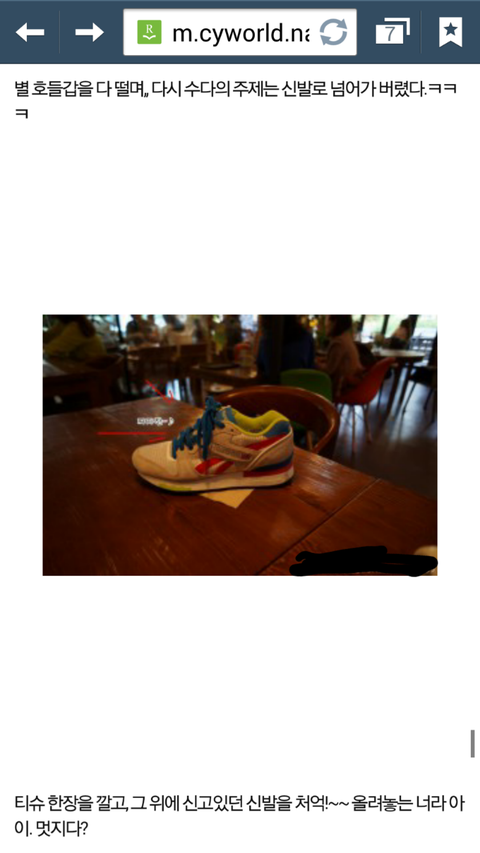 어제 메인에 뜬 블로그 구경하다가 깜놀함막말로 어디를 신고다녔을지 모른 신발을 티슈 몇 장을 깔고 테이블에 올려도 찝찝한데달랑 한장 받쳐놓고 신던 신발올리는게 멋있다는 표현에서 멘탈붕괴엄마따라온 아이가 저 테이블에 앉아 흘린 음식 조각이라도 입에 넣으면 아무리 행주질했다해도 ᆢ아니지않나요
