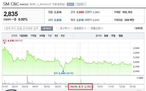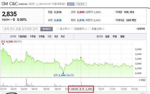 골치 아프지만 아래 그래프를 보면 2013년 8월 8일 3,185원에 불과하던 SM C&C 주가가 합병을 발표한 다음날 3,380원으로 6% 이상 오른 것을 알 수 있다.
