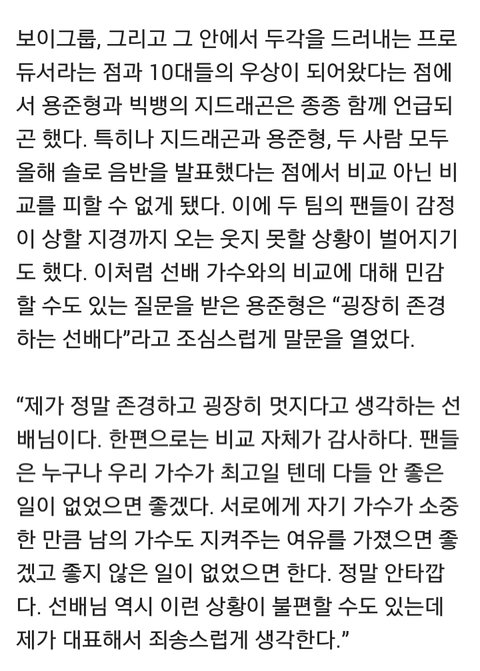 요번에 용준형 솔로앨범활동 때도보면 음악적 색깔부터 뭔가다르다는게 느껴지는데 랩하고 작사작곡 하는사람으로써 추구하는게 어느정도 비슷하고 좋아하는게 좀 겹칠수도있는거지 처음부터 끝까지 다따라하는것도아니고 사람인데 추구하는것 비슷하다고 무조건 따라한다고 보면안됀다고생각해요 물론 지디팬분들께선 기분나쁠수도있지만 따라하는건 절대아니거든요 용준형도 인터넷에 그런글많이있어서 많이봤을거예요 따라한다는 수식어가 아직까지도 붙어다녀서 많이속상하네요 마지막으로 지디도 용쥰형도 빅뱅 비스트 모두 흥합시다~♥!ㅇ