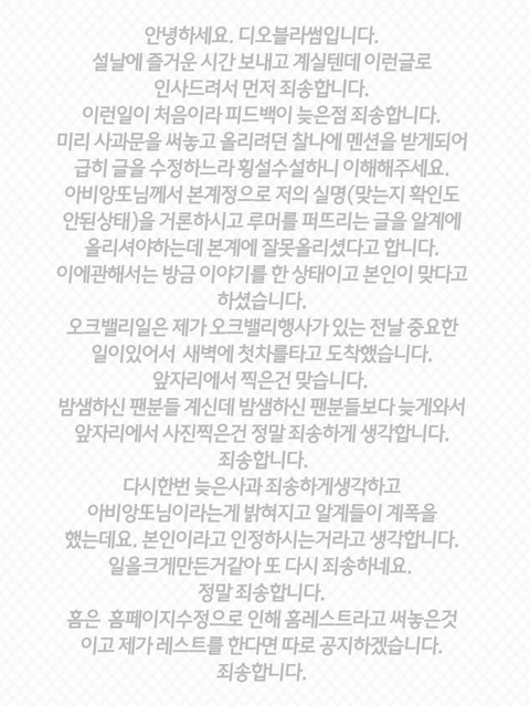 안녕하세요. 아비앙또입니다. 방금 저지른 일 때문에 디오블라썸님과 얘기 끝에 다시 글 올립니다. 사람이 이런 실수들을 자주 하기도 힘들텐데 저는 이런 일로 여러분께 사과를 드리는 경우가 많네요. 행동이 조심치 못하고 생각이 짧았던 점 죄송합니다. 방금 전 저는 알계를 판다던게 본계로 저격을 해버리는 큰 일을 저질렀습니다. 이 역시 짧은 생각이 울컥해버리는 탓에 생겨버린 일입니다. 처음부터 의도적으로 다른 홈을 까거나 욕하려는 생각은 없었습니다. 오크밸리 밤샘을 해보신 분들은 아실거라고 생각합니다. 그 당시 그 곳이 얼마나 추웠고 상황이 좋았던 것만은 아니라는 걸요. 서치하다가 알계들이 쓴 글을 보고 순간 정말 울컥했고 화가 났던 것이 사실입니다. 그 덕에 이런 무례한 짓을 저질러 버렸고요. 아무리 반쯤 정신이 나갔더라도 그런일을 하면 안 된다는 걸 알면서도 말입니다. 사실인지 아닌지 확인도 하지 않고 서치에 걸린 글만 보고 믿고 뒤에서 알계를 파 욕을 하려던 점과 마치 그걸 직접 보고 제 자신이 디오블라썸님을 전부 아는 것 마냥 써 올린 것 디오블라썸님께 진심으로 사과드립니다. 모든 상황은 트위터를 보고 안 사실인데 저는 알계를 만든다는 것도 까먹고 무턱대고 아비앙또 계정으로 일을 벌인 케이스인지라 다른 알계는 제가 아님을 말씀드립니다. 아비앙또 홈은 현재 두 명이서 운영 중입니다. 저 혼자 저지른 일 주무시고 계시는 다른 분 께 사과 드리고 그분이 일어나면 여러 이야기를 하고 아비앙또에 여러번 물의를 일으킨 제가 자숙을 하려 합니다. 이 조용한 새벽에 눈살 찌푸릴 일을 만들어 여러분 그리고 디오블라썸님께 진심으로 사과드립니다. 죄송합니다.