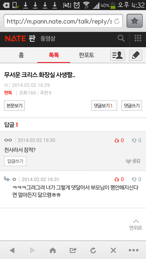 아 답글단거 조카 웃겨ㅋㅋㅋㅋ이런식의 댓글은 또 첨봤네ㅋㅋㅌㅌㅌㅌㅌㅋㅋㅋ조카 해탈한줄