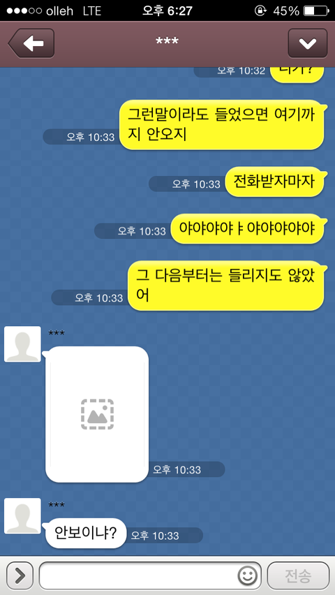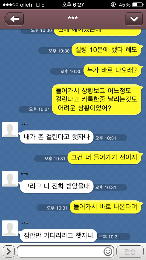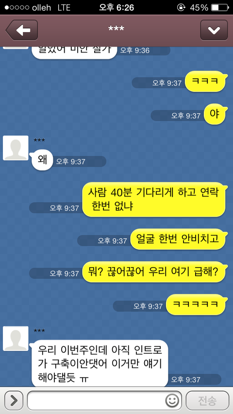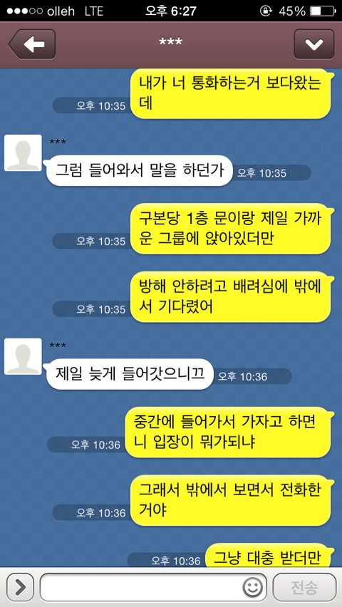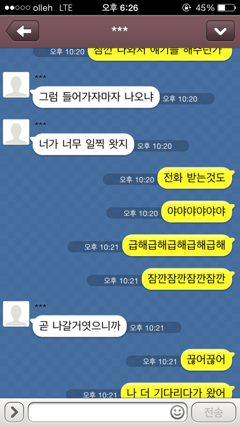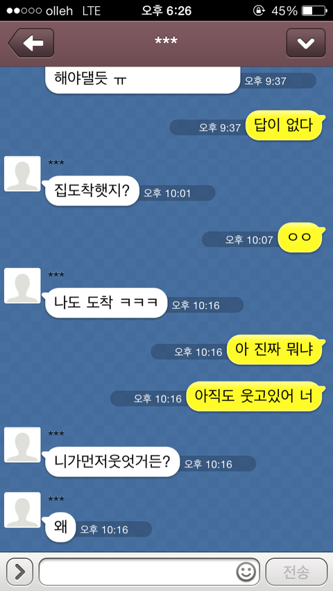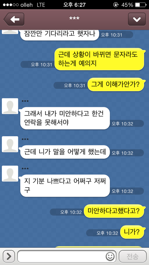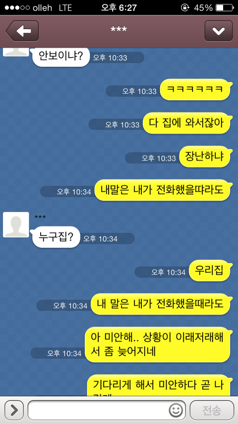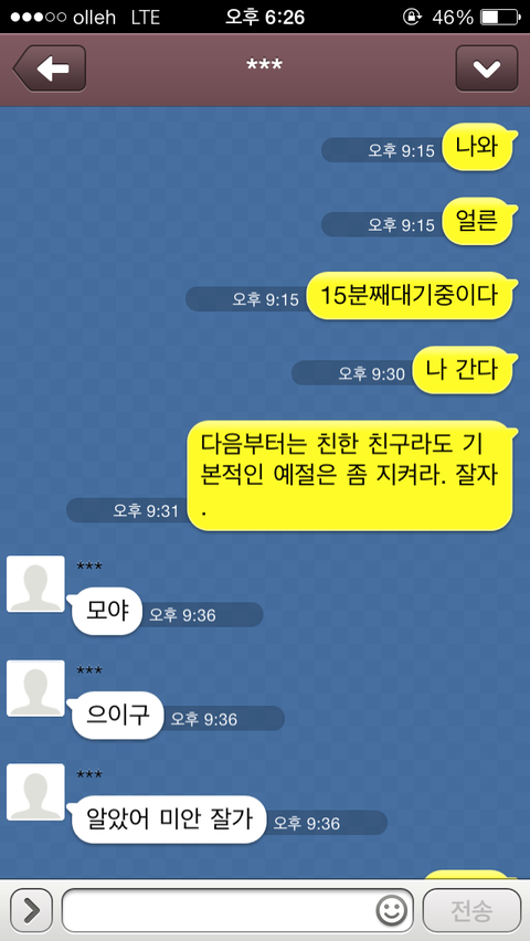 간다고 카톡을 하니 그제서야 "모야, 알았어 미안 잘가" 이렇게 카톡이 오더군요.