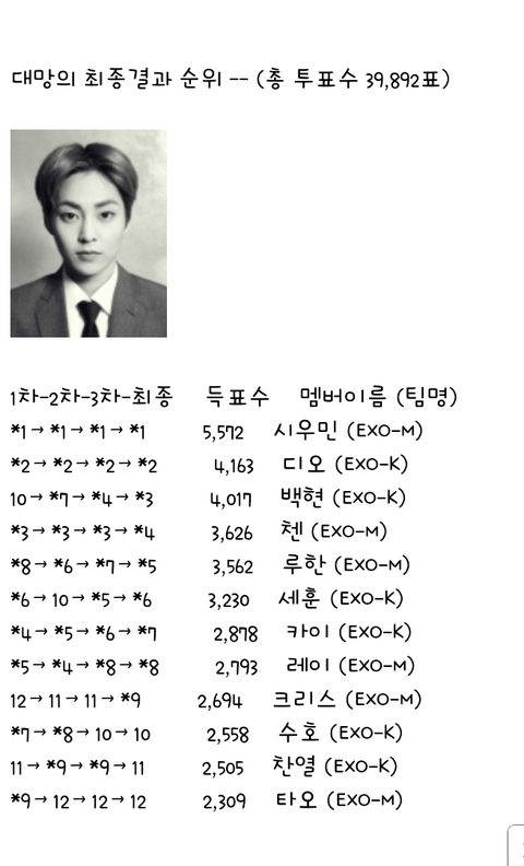 눝투표때랑 비슷함.(눝 투표순위는 시우민>디오>첸>백현>그외 기억안난다;;)