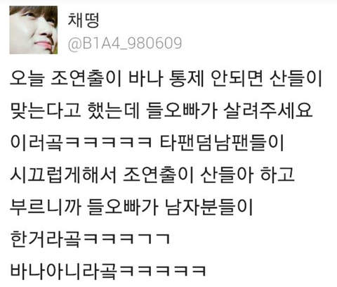 산들이가 다급하게 남자들이라고 바나아니라고 다급하게 외쳐댔다고한다ㅋㅋㅋ자기팬들이 떠든거 아닌데ㅋㅋㅋ지 팬들 한테 뭐라하니까 억울했나봨ㅋㅋㅋ