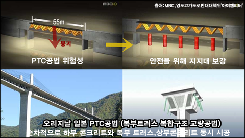 일본은 구조적으로 안전하게 순차적으로 하부 콘크리트와 복부 트러스, 상부 콘크리트를 동시에 시공하는 방법입니다. 그러나 한국은 동시 시공은커녕 교각과 교각 사이에 지지 받침대를 받치지 않고 콘크리트를 타설했습니다.