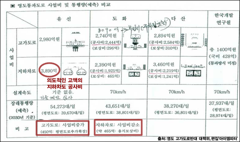 부산시는 '사업비 및 통행량 예측 비교표'를 통해 지하차도 공사의 공사 비용이 훨씬 많이 들기 때문에 고가 교량 방식으로 건설해야 한다고 변명했습니다.