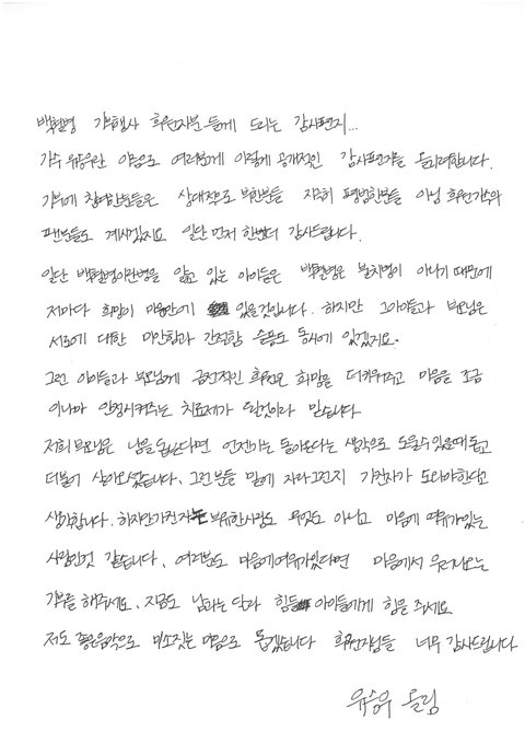 알고보니 작년에 유승우가 백혈병 걸린 여자애기를 후원하는데 동참해준 팬들한테 직접 쓴 편지라고 함
