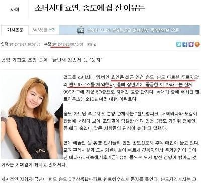 한편 같은 소녀시대 소속 효연(24)은 송도 210㎡ 펜트하우스를 2012년 분양 받았다. 펜트하우스는 총 6가구로 분양가는 12억9000만원이다. 이 아파트는 지하 5층 지상 60층 높이의 초고층 주상복합이다. 총 999가구 규모다. 입주는 2015년 9월이다. 인천공항이 가깝고 서해 바다를 조망할 수 있다.