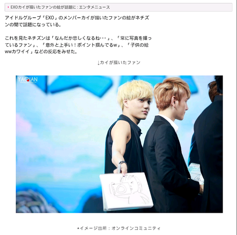 아이돌 그룹 「EXO」의 멤버 카이가 그린 팬의 그림이 네티즌의 사이에 화제가 되고 있다.