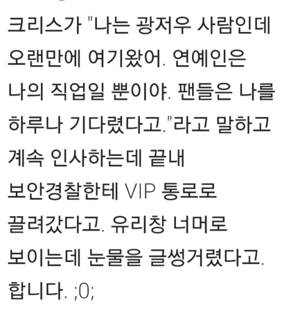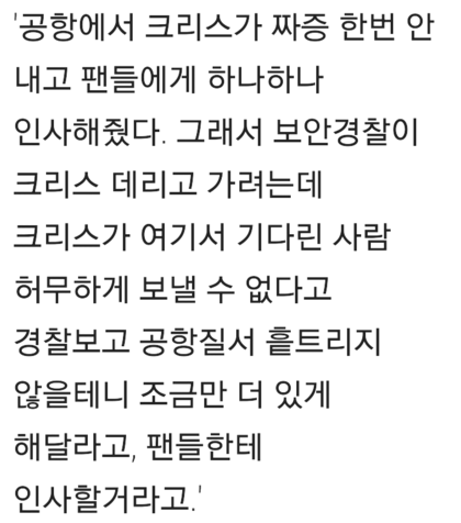 입덕하고 나선 한명도 빠짐없이 완전체 다 좋아하고있는데 가끔가다 완전체 팬이라는 사람들이 '크리스 별로였는데 쇼탐보면서 좋아짐', '비호감이었는데 급호감'이런 반응 많더라...크리스요즘 쇼탐에서 빵빵터지잖아 그랄때마다 기사뜨잖아? 기사댓글에 저런 반응 빠지지않음...너무속상함 완전체팬이라면서 뭔비호감이야...그러면서 실물은 크리스가갑이지 이러고 성격은별로다 이러고...쇼탐에서도보면 인사잘하고 10화 신발사러갔을때도 계속 인사하고 달고나파는 아저씨께도 계속인사하고 빵보고 아이거 진짜맛있는건데~~ 뭐이러고 진짜착하고 멤버들도 잘챙겨줌 엠의리더답다!!크리스 사랑해