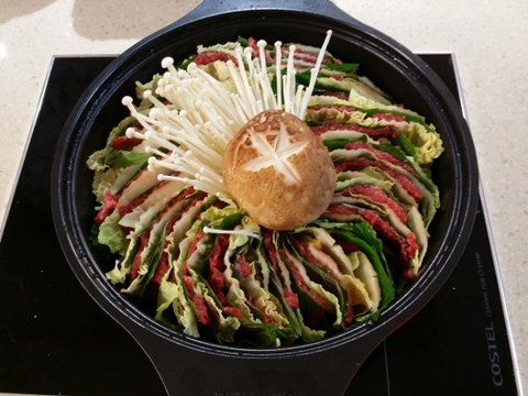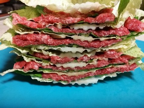 배추.깻잎.샤브샤브용소고기 켜켜히쌓아 잘라서