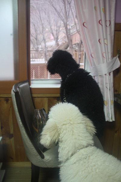 써니가 의자로 폴짝 올라가 창밖을 보니 어느새 미키도 와서 구경중