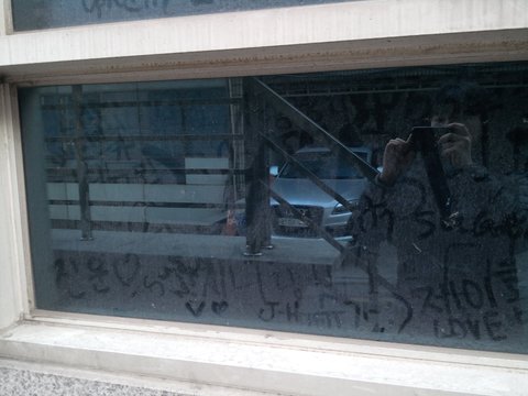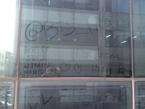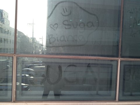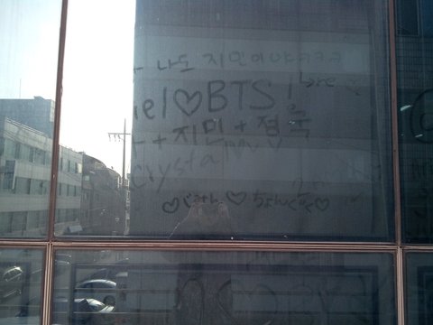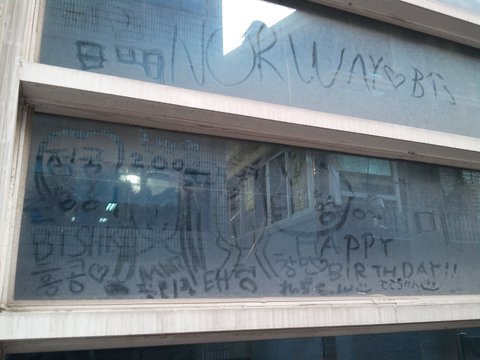 사람은 없었는데 유리창에 아미분들과 아이엠 분들의 지문낙서가 새겨져있더라구요..