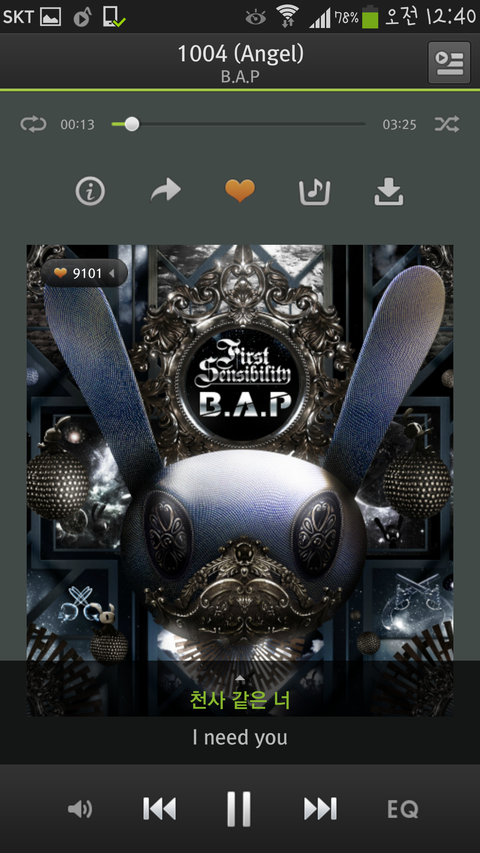 이렇게 곡을사서듣는다는게 뿌듯한건줄몰랏음.. 정말솔직히말하면 전에는 4shared 이런사이트에서 공짜로다운로드받고했는데 지금이렇게 떳떳하게 돈내고다운받으니까 기분좋고뿌듯함진심.. 비엪한테도도움되고 어쨋든 인증~ 근데 보니까 이거 한곡반복재생하면 스밍안된다고막 머라머라하던데 되는거맞아? 그냥한곡가지고 계속 뺑뺑이돌리면대는겨?