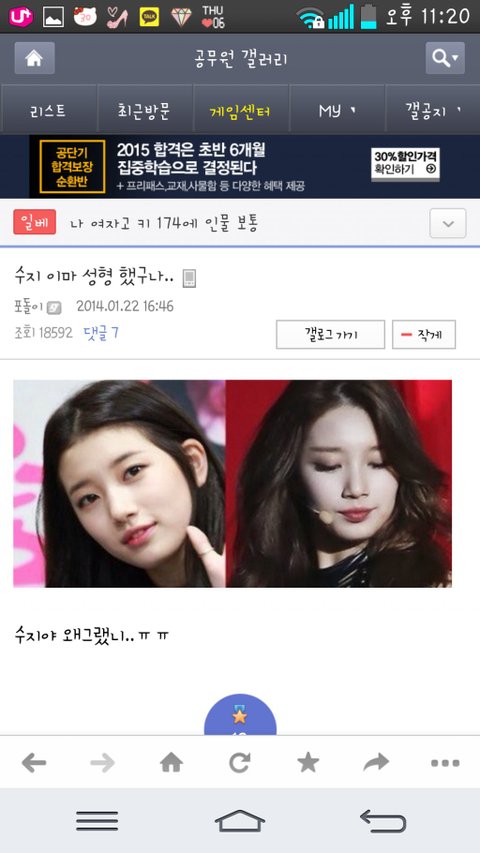 수지팬들아 수지 자연이라며? 근데왜 쌍수도하고 이마도넓히고 납작했던이마 볼록하게함? 자연미인어디감??