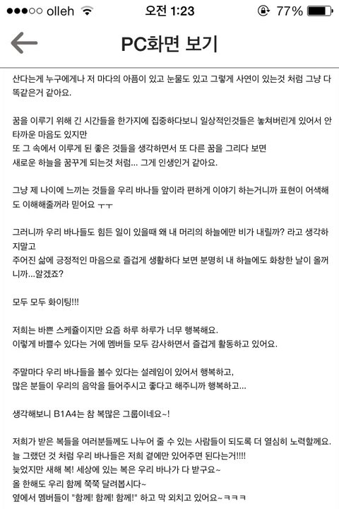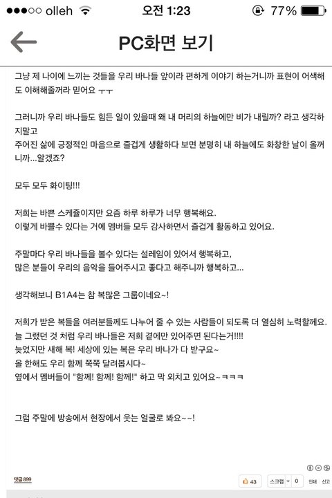 휴 ㅋㅋㅋ 마지막으로 B1A4 7번이나 일위 축하해! 걸본때 바나덕에 2위했다고 트윗올리던게 엊그제 같은데... 데뷔때부터 팬인 나로선 ㅣ자식키운거 같고 그러네 ㅋㅋㅋㅋ 그리고 산들아 감기 빨리 나아ㅠㅠㅠ