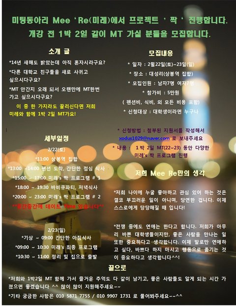 [미팅동아리 Mee Re(미레)](D-7)와 함께 개강 전 1박 2일 MT가실 분을 모집합니다~ (짝 매칭 프로그램) ~ 2.12(수)까지