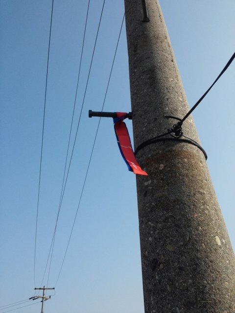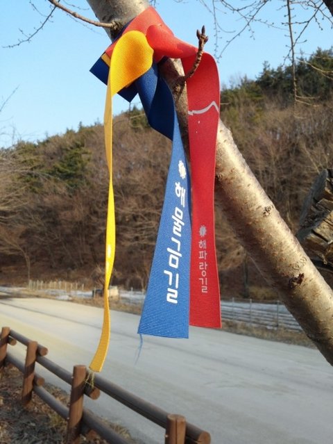 해파랑길은 빨강+노랑 조합, 파란색은 동해 해물금길 표식,