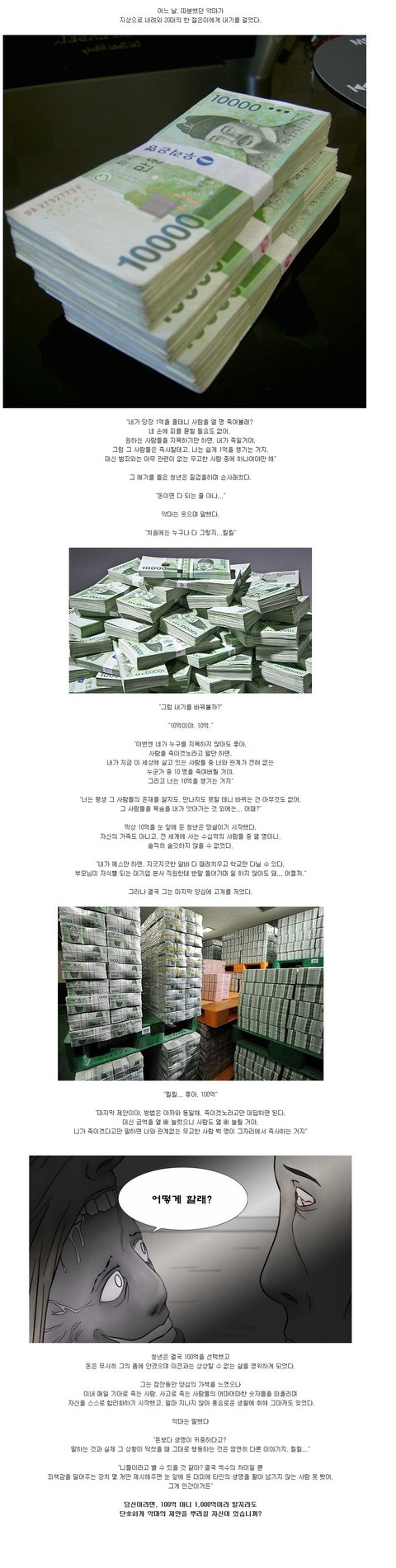 그리고 그 악마는 나에게 돈을 주었다. 그러다 문득 떠오르는 생각하나가 나를 공포 속에 가뒀다. '혹시 그 악마가 나 말고 다른 사람에게도 같은 제안을 한다면?' 이 넓은 세계의 타인이 바로 내가 될지도 모른다는 불안감. 그렇게 하루하루를 피말리며 난 어느새 죽음을 맞이했다.