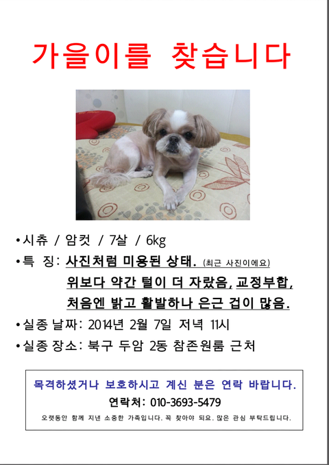 새벽에 가을이 찾으러 동네 몇 시간을 돌아 다니고..광주동물보호소 사이트에 글 올려도 보고.. 급한 데로 전단지 만들어서 붙이고 왔는데도 연락 하나 없네요.