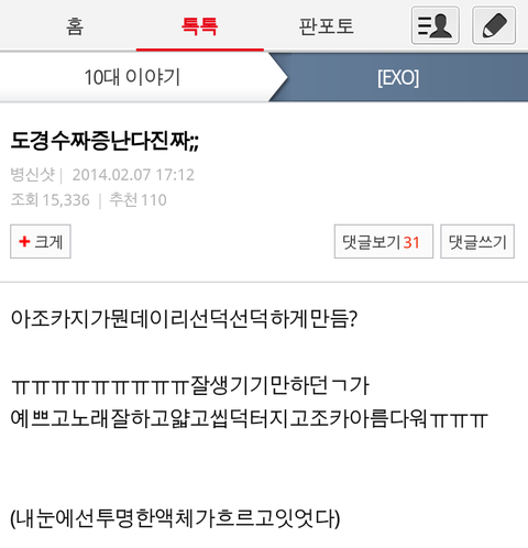 지들이 우리보고 자극적인 제목 쓰지 말라면서 지들이 더쓰더라? 비엪보고 언플 작작 하라 할 시간에 지들 오빠나 그만 하라해 팬톡 톡선 추천순도 다 지들오빠면서 개지랄 떨긴 표절? 그럼 엑소 하고 에핑 왜 안뜨냐 ㅋㅋㅋㅋㅋ 엑소는 헬리콥터 노래 표절 했고 에핑은 꿈을모아서 표절 했잖아 ㅋㅋㅋㅋㅋㅋㅋ 이중성은 하여간 쩌네.