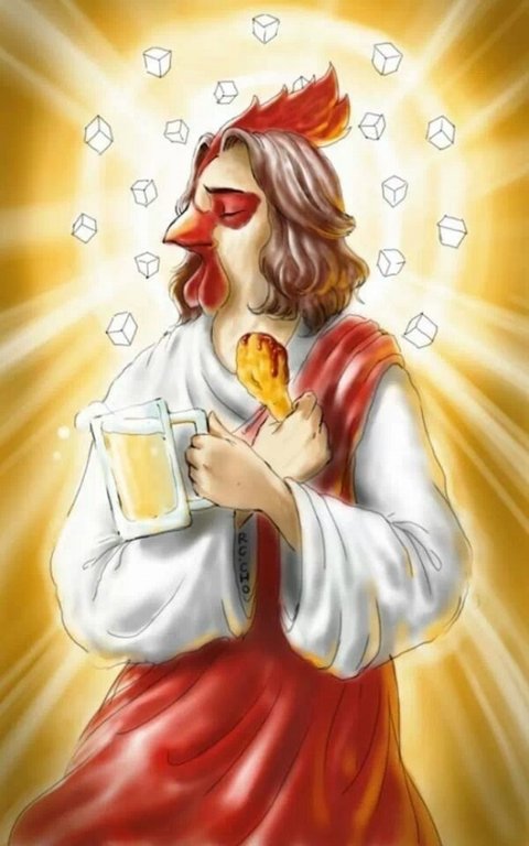 튀기소서 3장에 따르면 그는 뜨거운 기름솥에 들어가 튀김을 제 몸처럼 여기시어 온 몸에 두르사 마침내 훌륭한 후라이드 치킨이 되어 우리 앞에 오신 것입니다. 오오- 치렐루야.