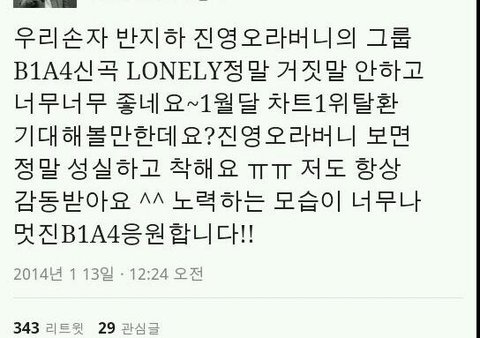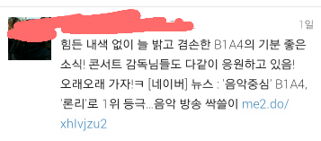진짜내가 b1a4좋아하는이유가 예의도바르고 초심잃지도않고 건방지지도않고 데뷔때부터지금까지 팬들대하는모습도 똑같고! 멤버들끼리 싸우지도않고 다친해서 내가 데뷔때부터지금까지좋아하는거같다 진짜 내가 언제까지 비원에이포를 지금만큼 좋아할지모르지만 진짜 평생 마음속으로 응원하는 팬할꺼같다진짜 사랑한다 b1a4 오빠들이있기에 바나가 잇는거임!!진짜 이번 노래 론리도 대박낫고 이번 콘서트도 대박낫음좋겟고 느리지만!!!더좋은 가수댓음좋겟음ㅠㅠ비포짱 사랑함♥